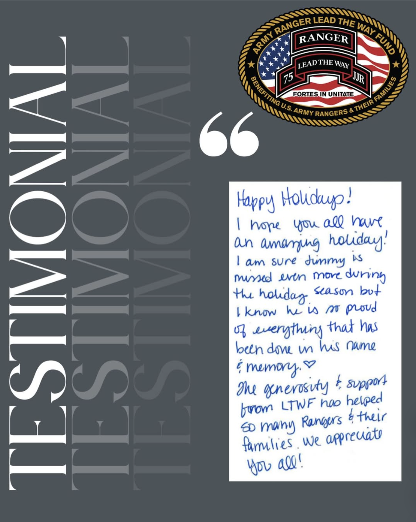 On this Feel Good Friday we are reflecting on holiday thank you’s and it’s truly inspiring to feel Jimmy’s presence still alive among us. His legacy shines brightly through the work of LTWF in the Ranger Regiment, showing the profound and lasting impact he made.